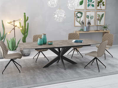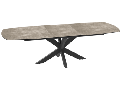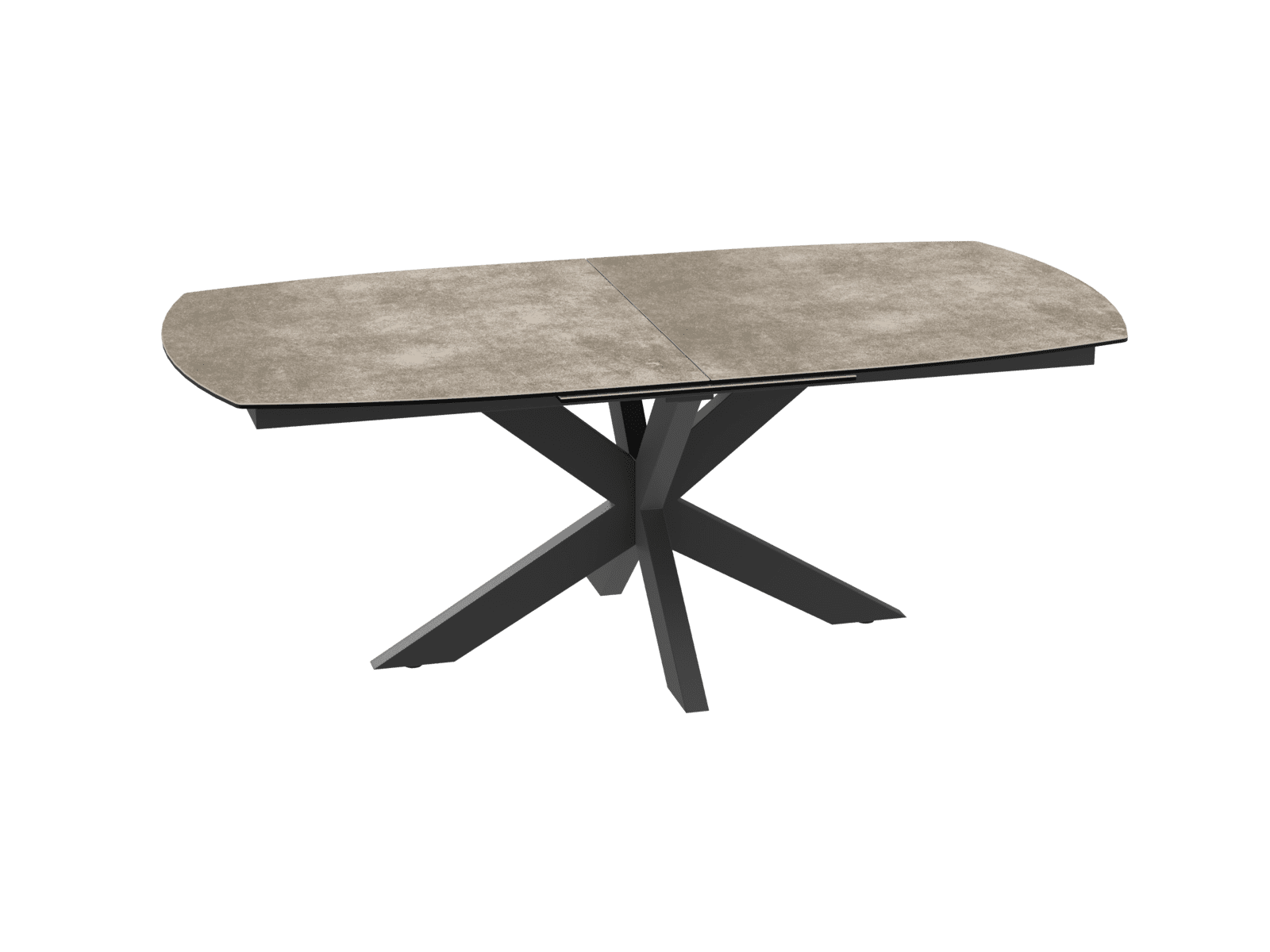 We are delighted to introduce the Arizona dining table. The Arizona dining table is 2m in length and 60cm wide. The table has a unique mechanism however and so by simply gliding the upper surface towards you, the table opens, the discrete extension mechanism lifts, the table opens in two and its surface expands to 260cm. The crossed legs of the Arizona table are made of black lacquered stainless steel. The surface is made of argile coloured ceramic glued upon glass. This anthracite ceramic is made in Spain.