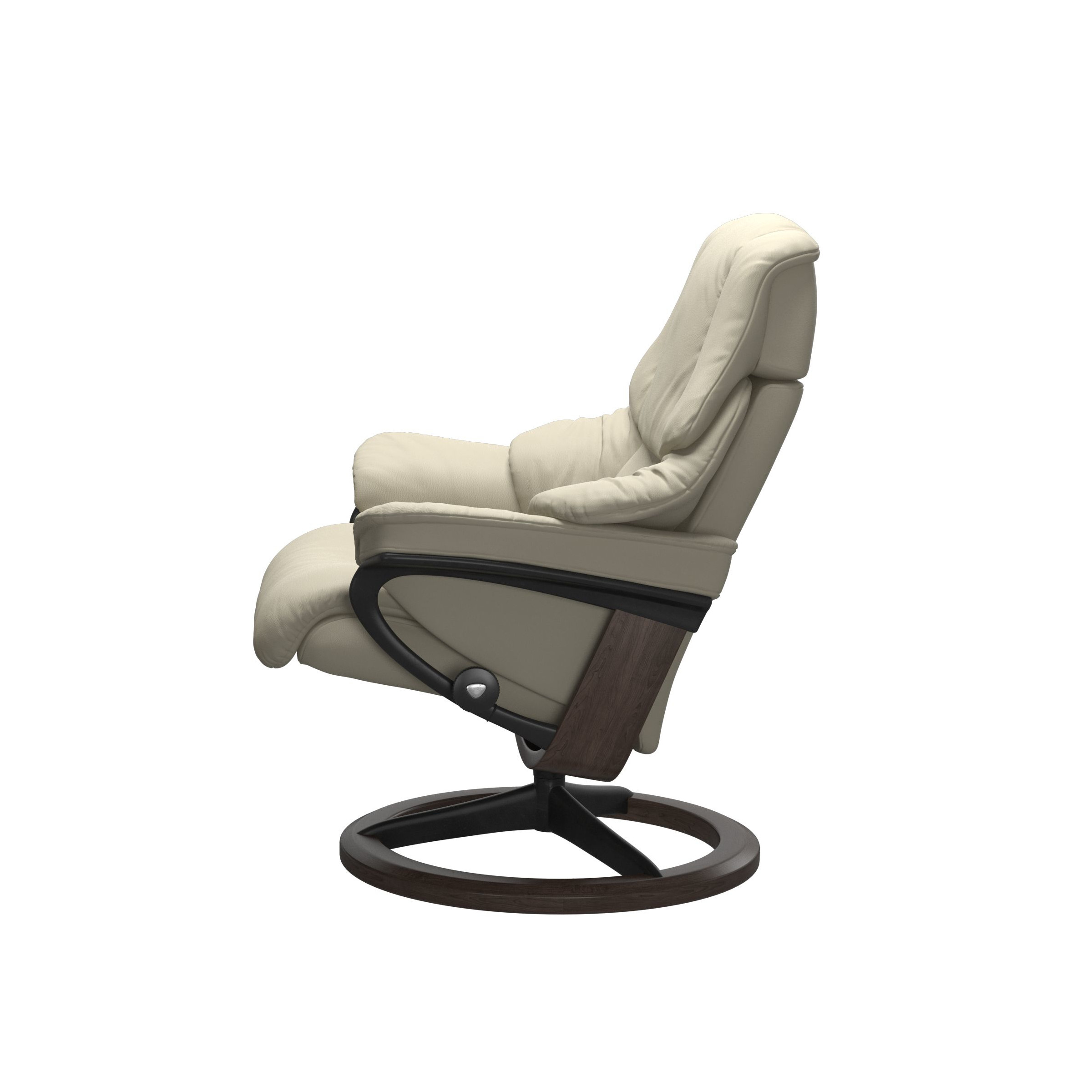 A coordinating Stressless Reno Footstool is available to add even more luxury. The Reno Chair is also available in medium and small versions, to suit different body sizes. All are offered in a wide range of fabrics and leathers, and with a choice of finishes for the base.